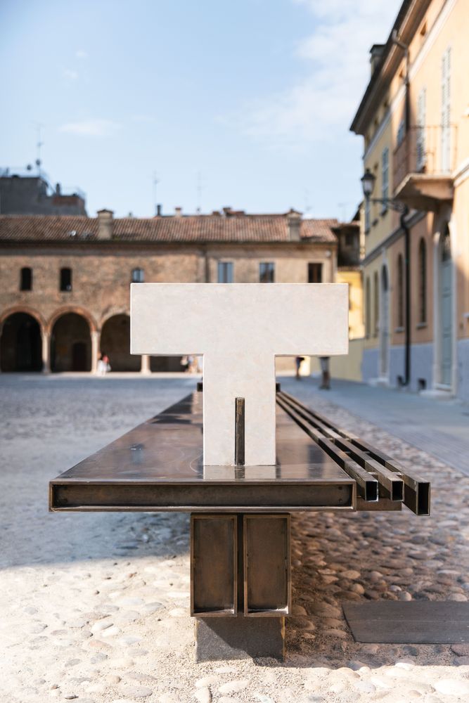 A separazione tra i luoghi principali dello spazio monumentale e le aree destinate alle attività commerciali è stata prevista una soglia costituita da alcune lastre incise celebrative della figura intellettuale di Leon Battista Alberti collocate al suolo. Tale scelta si lega alla tradizione lapidaria propria della città storica che a Mantova ha numerosi e straordinari esempi; su tutti il fronte della casa del Bertani e il sagrato di Santa Maria della Carità.