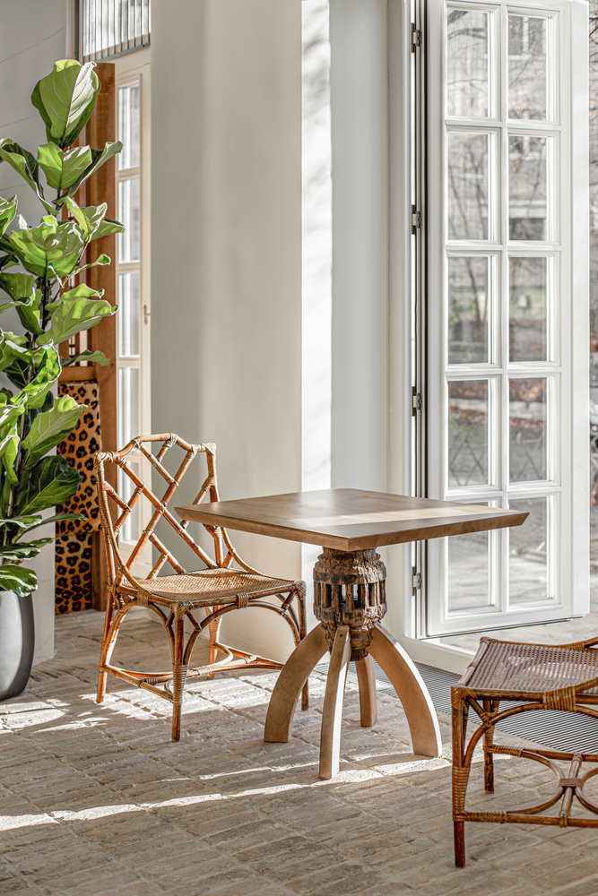 Alcuni mobili provenivano dai mercatini delle pulci d’Europa. Ad esempio, tavoli in metallo e poltrone in rattan sono stati acquistati al mercato parigino, sedie Thonet (legno curvato) sono state prese in Germania e Francia. Le sedie da bar in alluminio sono state acquistate a un’asta e le sedie estive in vimini sono arrivate da Londra.