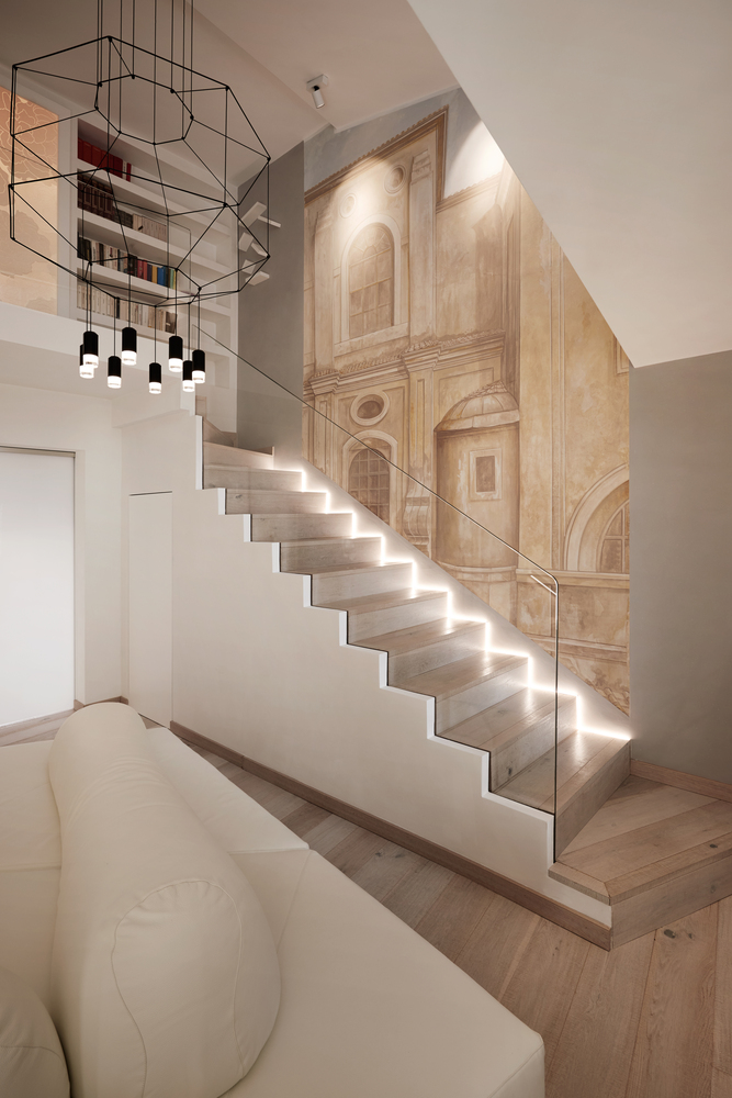 Il soggiorno a doppia altezza gode di molteplici affacci sui terrazzi e pone l’accento su una scala scenografica delimitata da un affresco preesistente, da un parapetto in cristallo totalmente trasparente e da una fascia luminosa che ne evidenziano la sagoma. Gli arredi e le raffinate scelte illuminotecniche ben si adattano all’irregolarità geometrica che caratterizza l’antico involucro architettonico, creando una raffinata armonia. Pannelli in krion incisi al laser e retroilluminati, punteggiano le diverse zone funzionali.