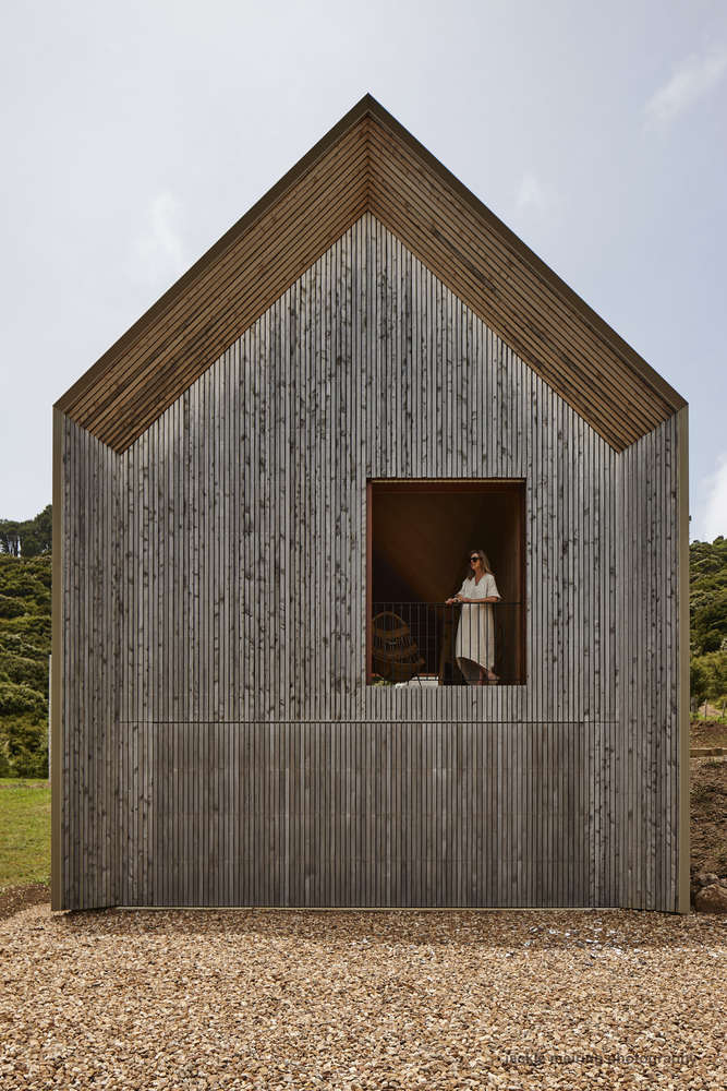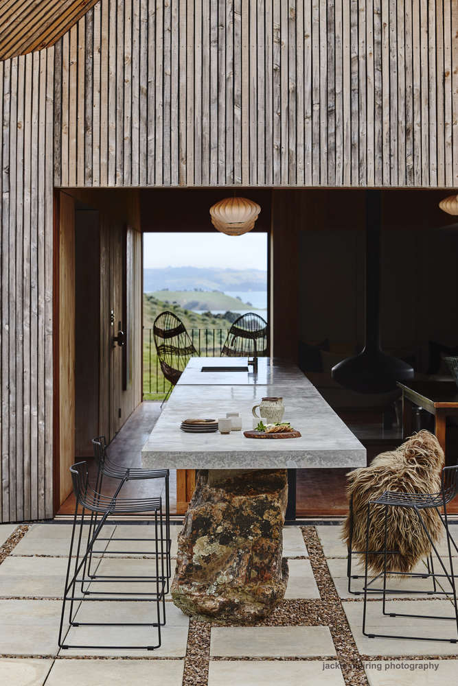 Un soggiorno simile a una cappella rivestito di legno antico che con il suo profumo inonda l’intero ambiente. Uno spazio perfetto per due o più conviventi (e un paio di cani). Uno spazio che offre la serenità di un ambiente intimo con camino. Un pasto in famiglia sulla panchina all’aperto, che unisce cucina e cortile. Spazi per dormire rivestiti di tela e legno scricchiolante come in uno yacht. Infissi delle finestre enormi. Un letto a castello che sembra intimo ma ampio allo stesso tempo.