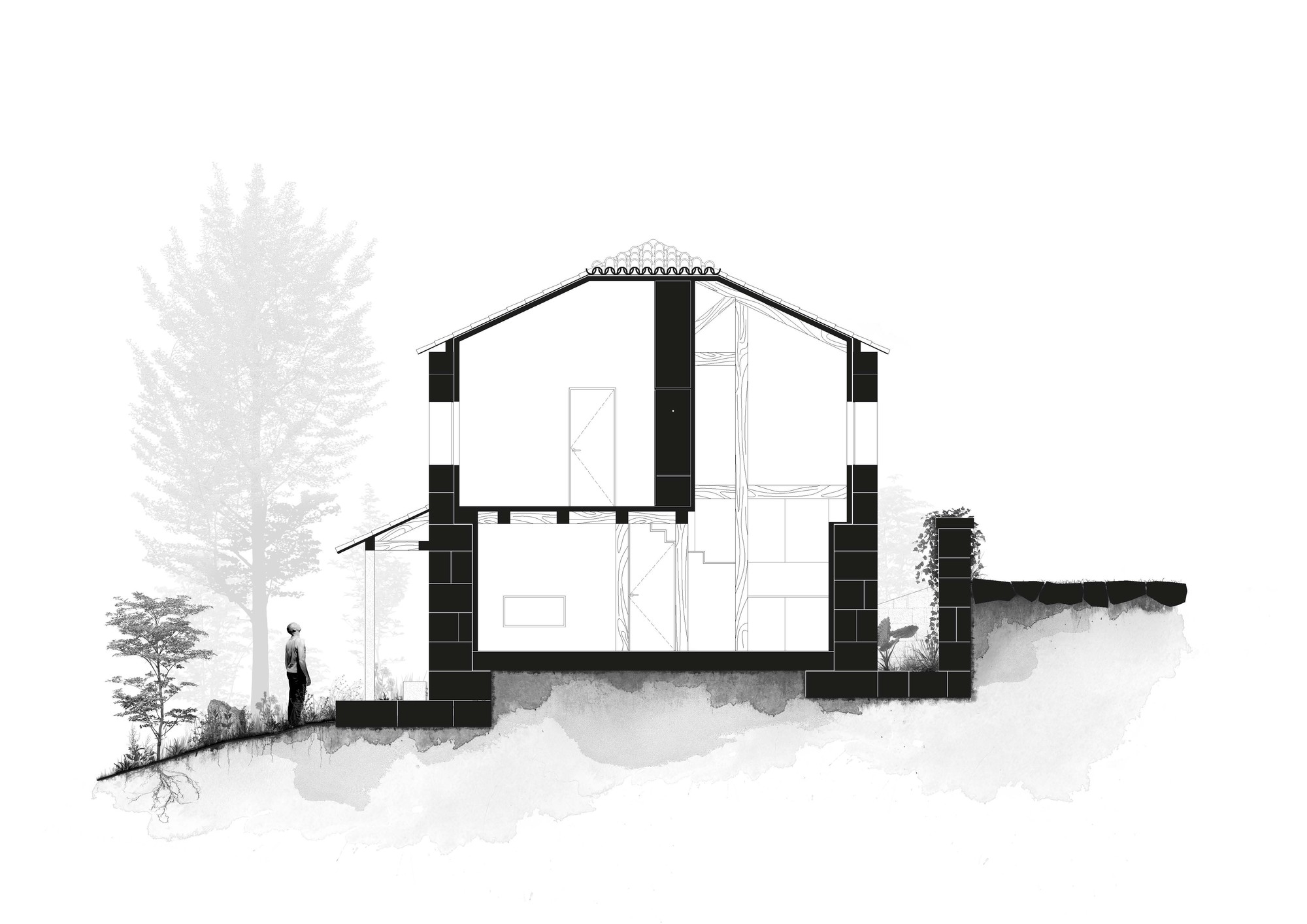 Quattro spessi muri in pietra sono gli elementi restanti di un’antica abitazione rurale. Come una scatola aperta al cielo, queste pareti racchiudono un volume non più diviso in due livelli, ma presenta le sue reali potenzialità volumetriche.