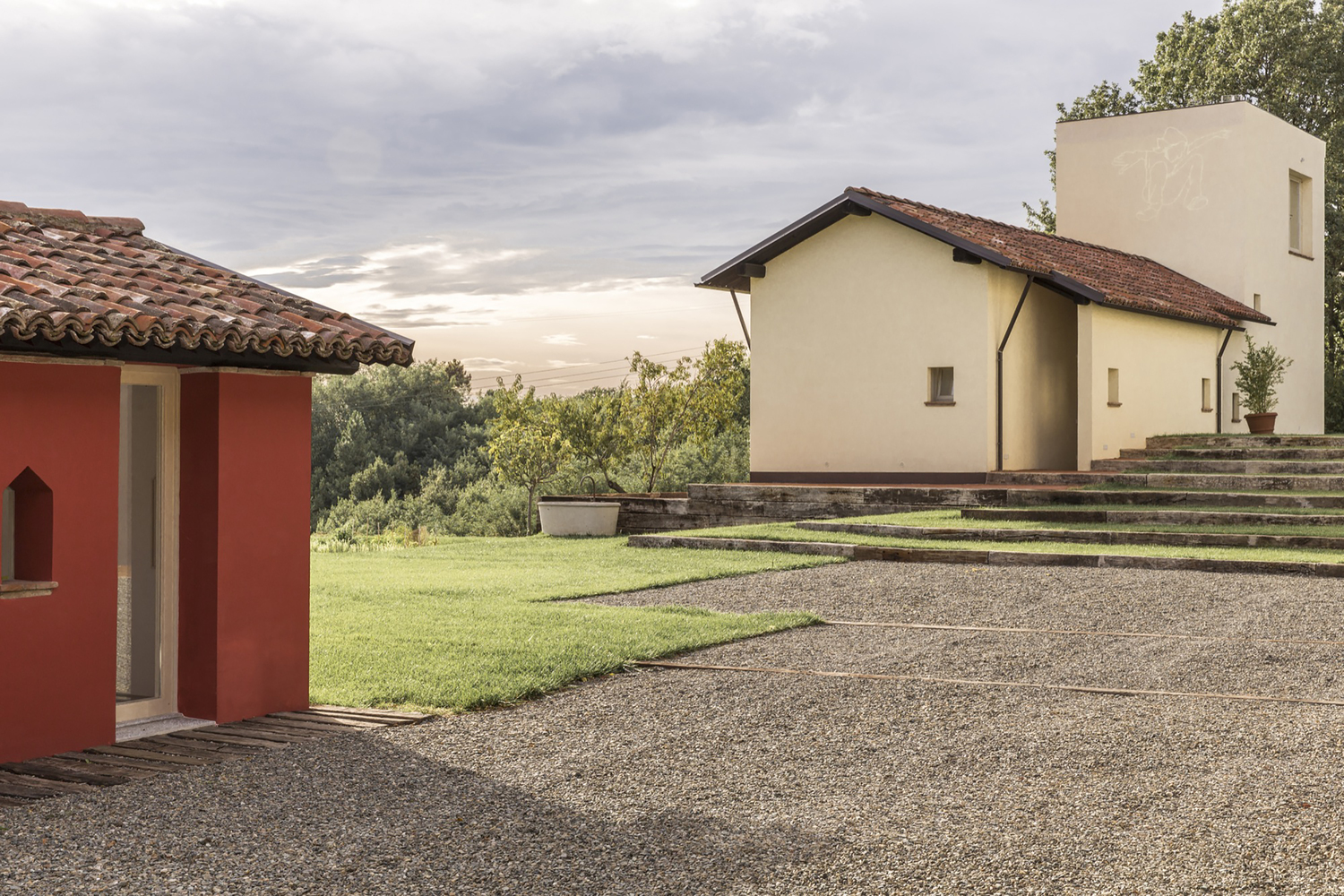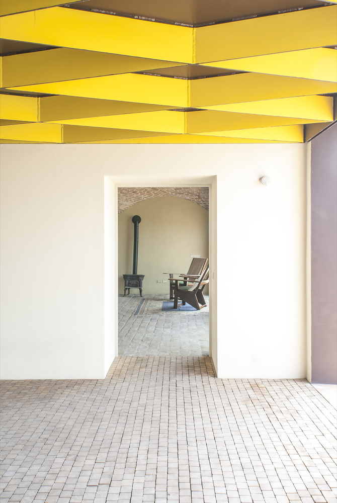 Le sue facciate quindi sono state ridisegnate tramite la bordatura in intonaco scuro delle preesistenti aperture e tramite un attento lavoro di ripulitura e salvaguardia dei campi in terra (quelle recuperabili). Gli edifici accessori, ognuno con le sue peculiarità costruttive e dimensionali, hanno subito adeguamenti specifici e dedicati, ma sono stati unificati dalla colorazione accesa dell’intonaco di finitura.