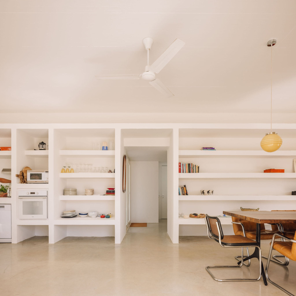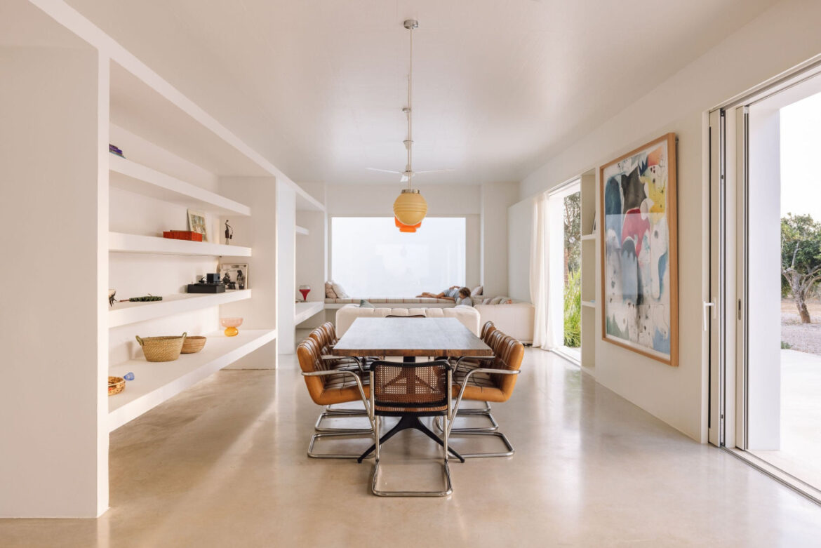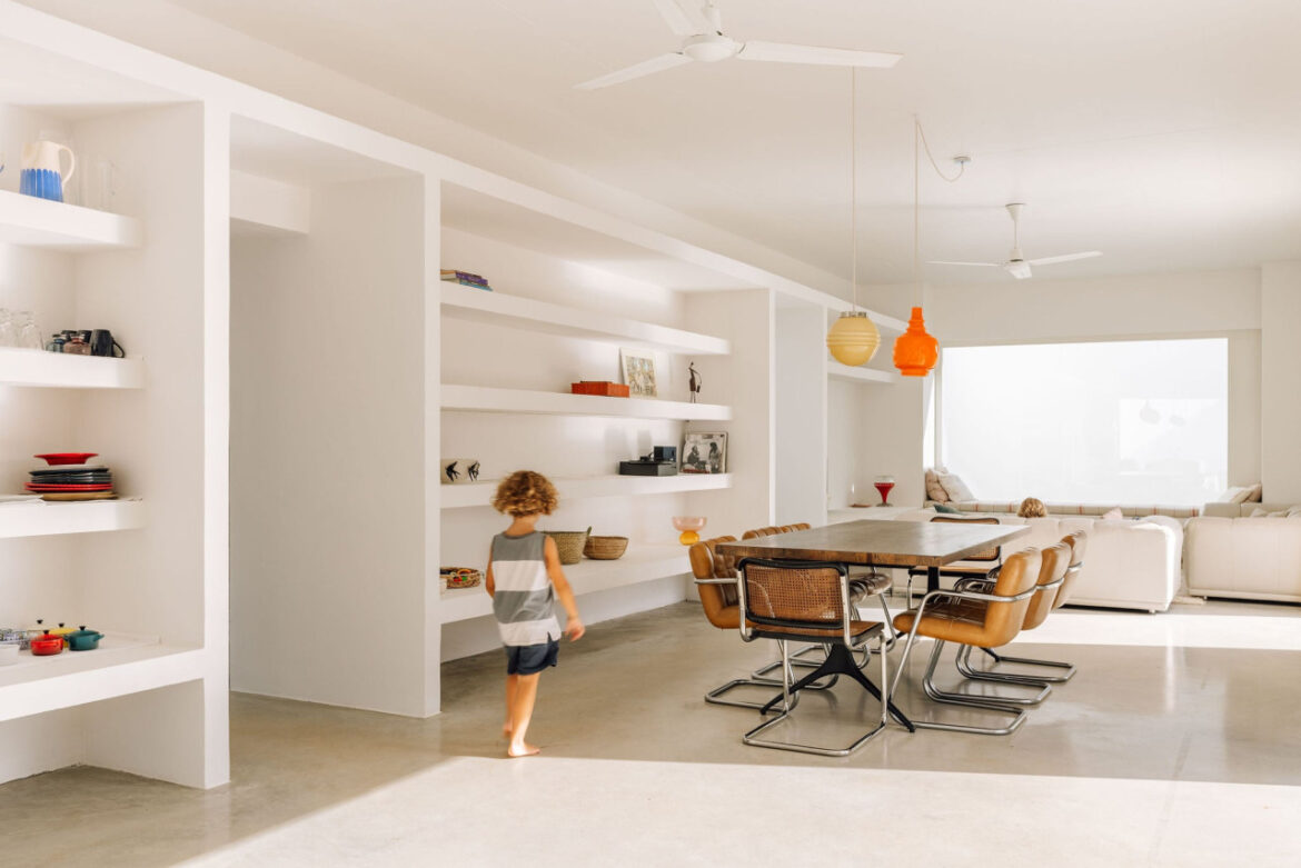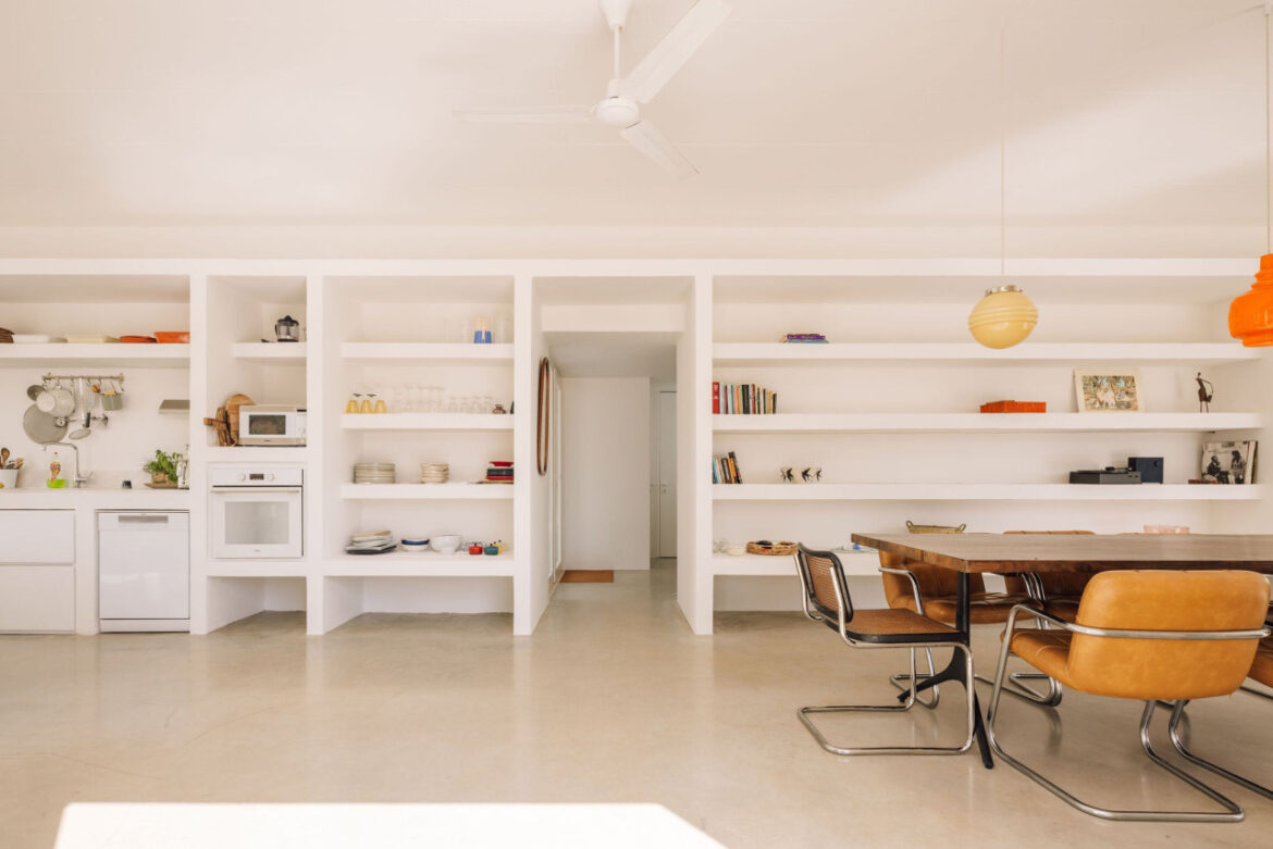 In a low and long volume is the kitchen, the dining area, and the living area in an open space.