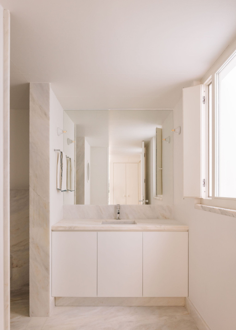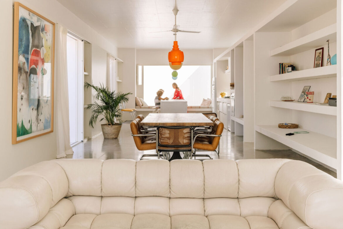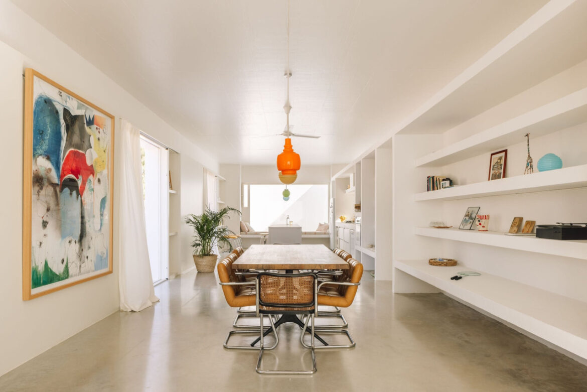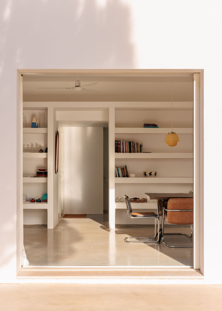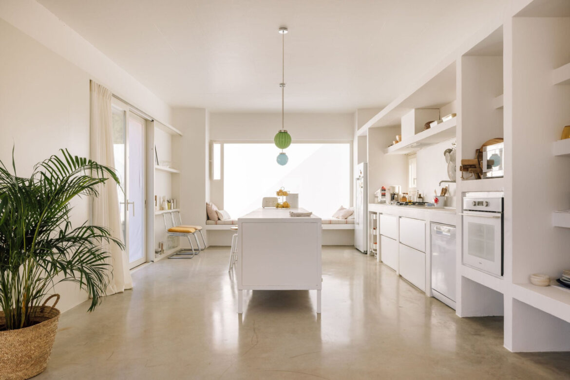 In a low and long volume is the kitchen, the dining area, and the living area in an open space.
