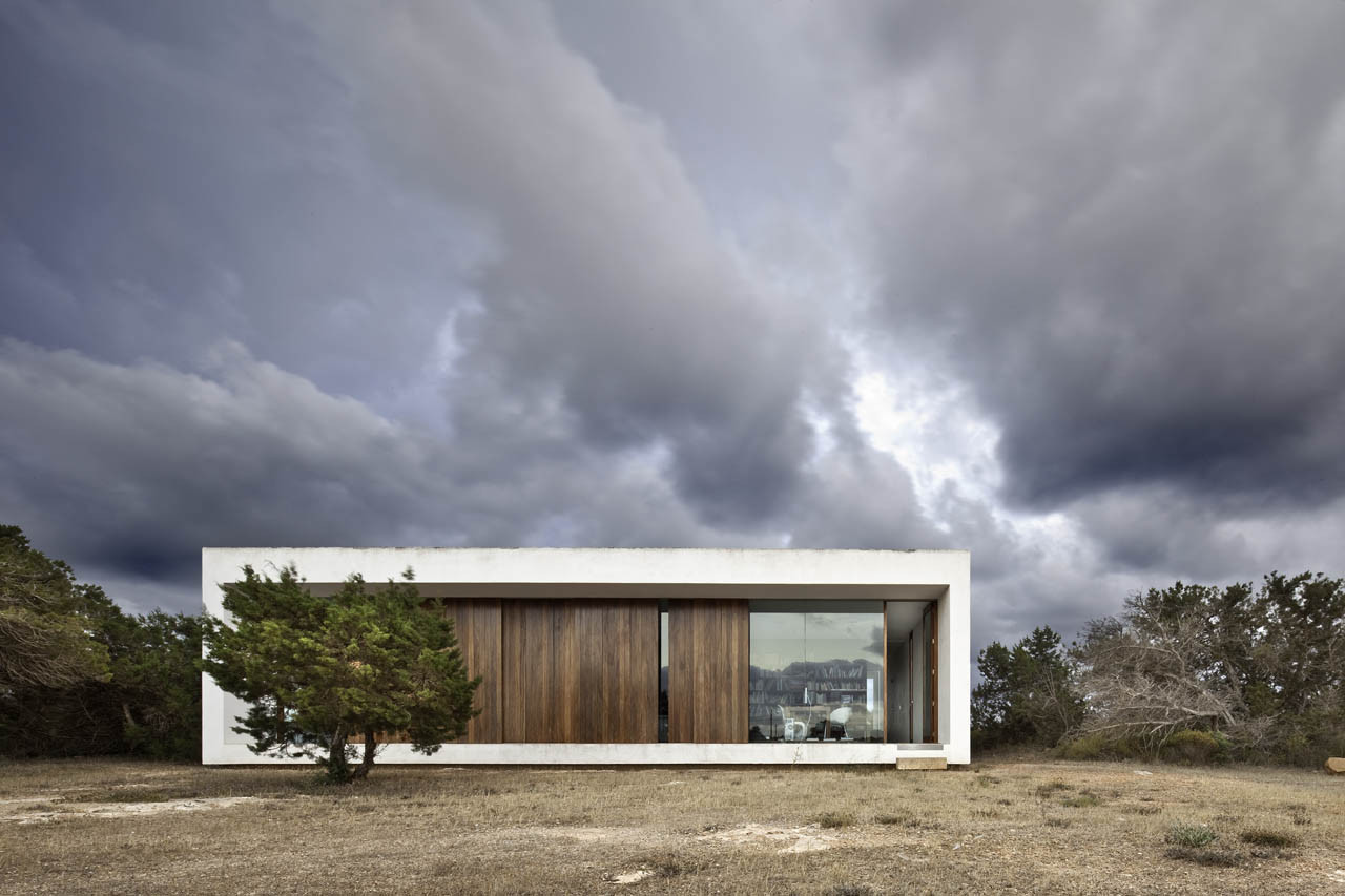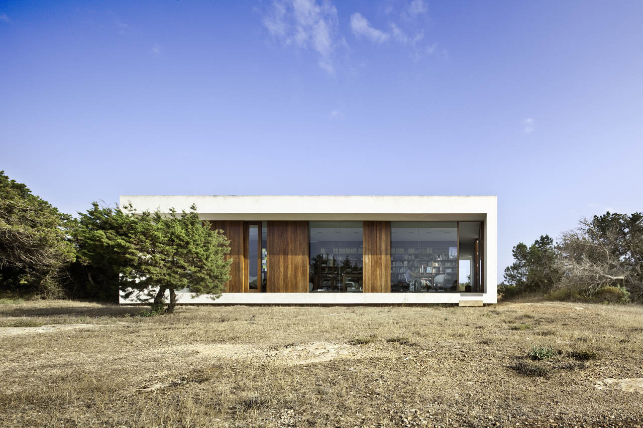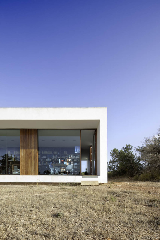 L’intervento si rifugia tra la vegetazione esistente e i frammenti di muretto a secco. Queste due condizioni delineano le dimensioni, l’orientamento e l’altezza di una costruzione di austera geometria che ha interessanti relazione con la tradizione architettonica di Formentera.